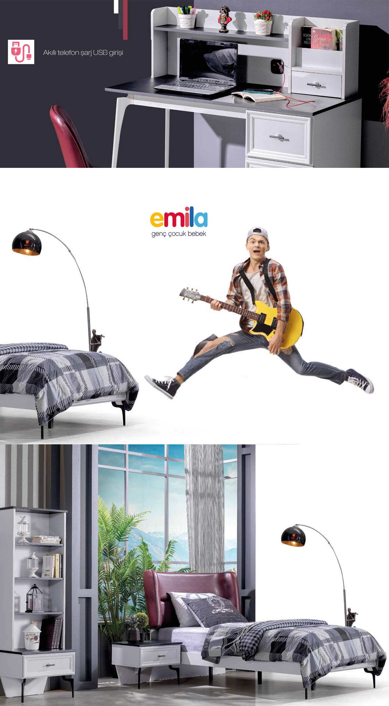 Baza ve başlık modüllerinde 2 farklı renk seçeneğiyle dikkat çeken bir görsellik sunuyor. Zarif Genç Odası 3 kapaklı dolabı ile de kişisel eşyalar için ekstra saklama alanı yaratıyor. Genç odalarının vazgeçilmezi olan kitaplık ve çalışma masası tasarımıyla gençlerin tempolu çalışma saatleri için ihtiyaçları olan ortamı sunuyor.